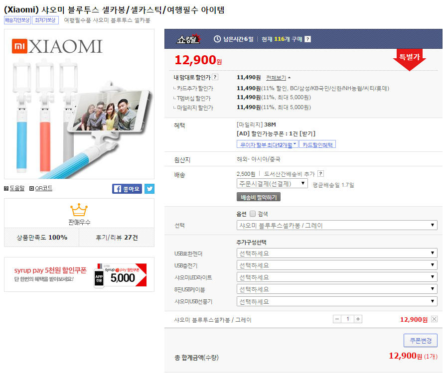 샤오미 셀카봉이 예전 특가딜 만큼 안나오네요.