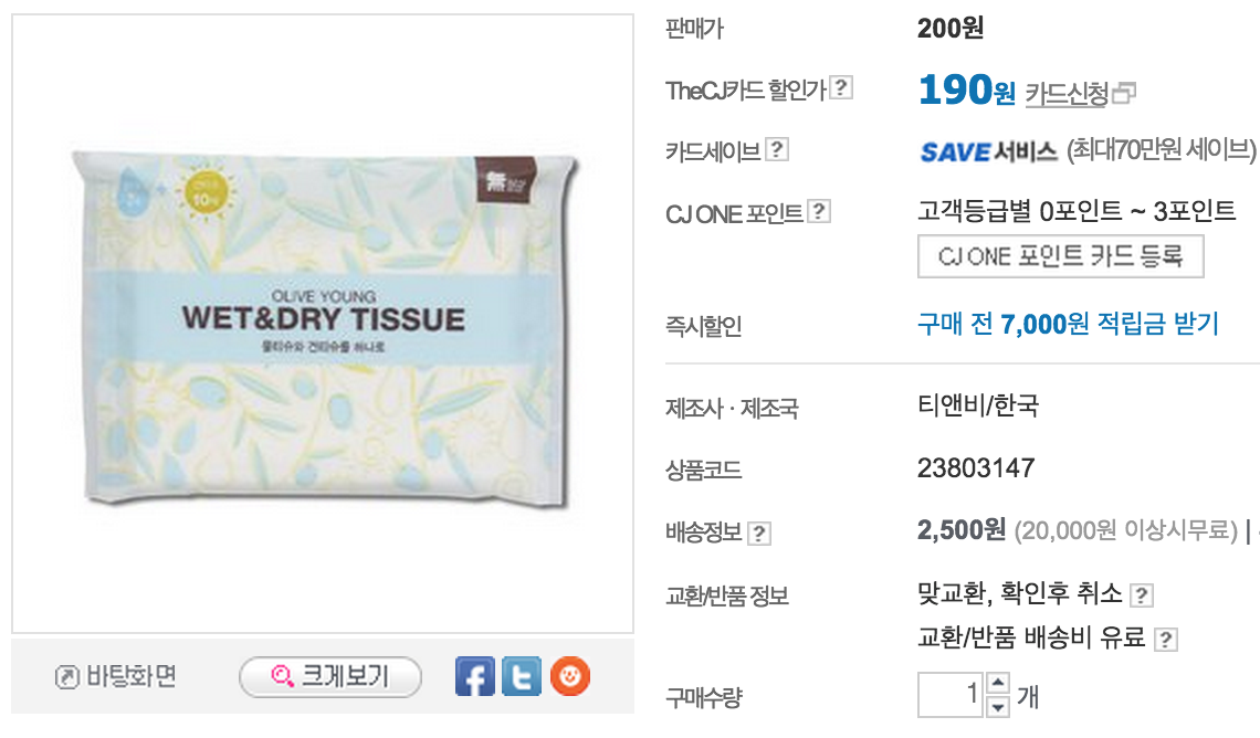 [CJ몰] 올리브영 WET&DRY 티슈 (200원/2,500원) > 국내핫딜
