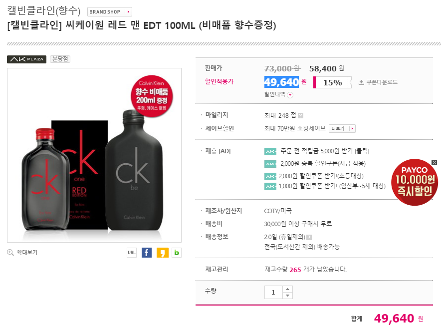 11번가에서 싸구려 냉장고 바지 같은거 끼워서 5만원 넘기고 앱에서 5만원 당 1만원 할인쿠폰 받아서 쓰면 그게 어쩌면 더 좋을 것 같아요. 신세계몰에선 CK여름향수+CK One 200ml테스터 행사하길래 올리려 봤더니 11번가에선 며칠새 내린 모양이네요. 다른 곳도 파는 듯 하니 살펴보셔요. |