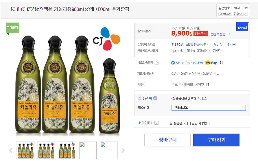 [지마켓] 카!놀라유 900ml*3+500ml*1 (8,900/0) > 국내핫딜