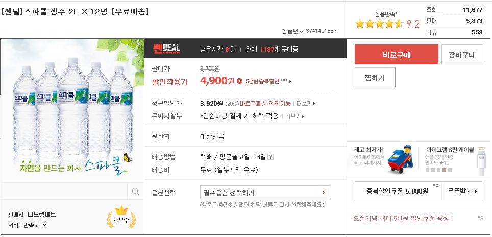 스파클 생수 2L 12병짜리가 4900원입니다.