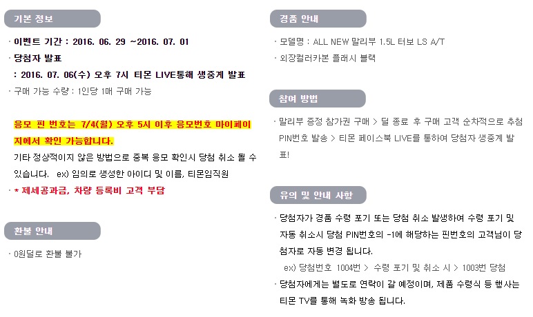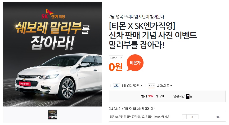 티몬에서 올뉴 말리부 증정이벤트를 진행하네요.