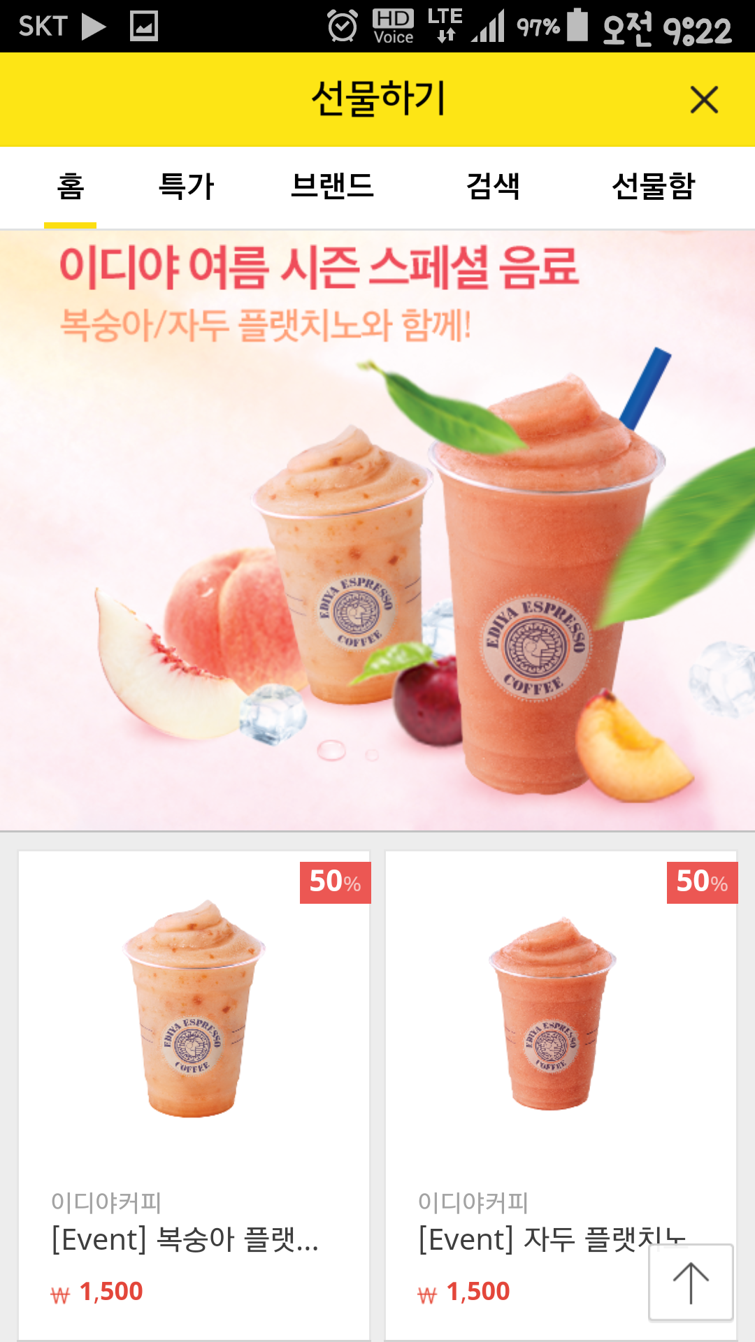 [카카오톡 선물하기] 이디야 복숭아/자두 플랫치노 50% (1500/0)