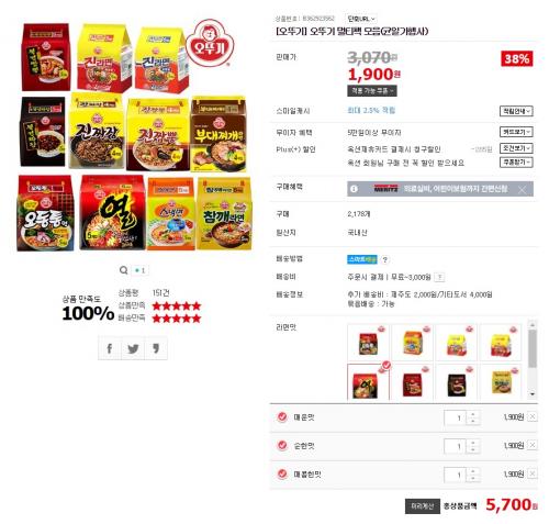오뚜기 진라면, 열라면, 북경짜장, 북경짬뽕 등 1,900원입니다.