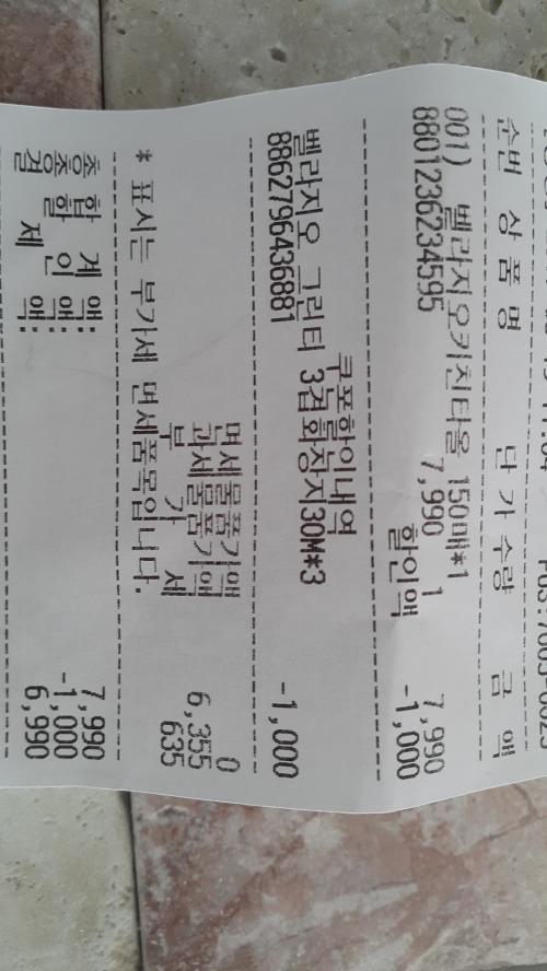 벨라지오 키친타올 150매 x 12롤 짜리를 3일장이라고 7,990 에 붙어있는 데 1000원 할인쿠폰 이용하여 6990원에 가져왔습니다.