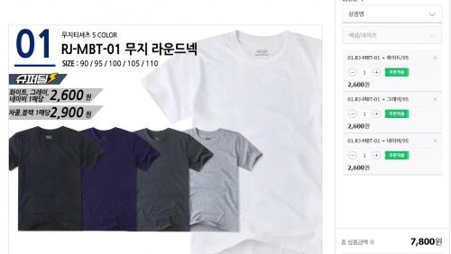 무지 라운드 티 백색, 그레이, 네이비 색상에 한해 2,600원에 판매중입니다.