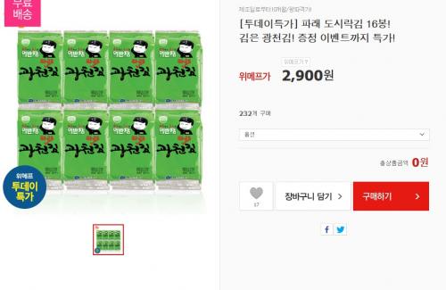 위메프에서 파래 도시락김 16봉을 2900원에 팔고있습니다. 동네 마트에서 16봉 기준 약 3000원 정도에 팔고있는데