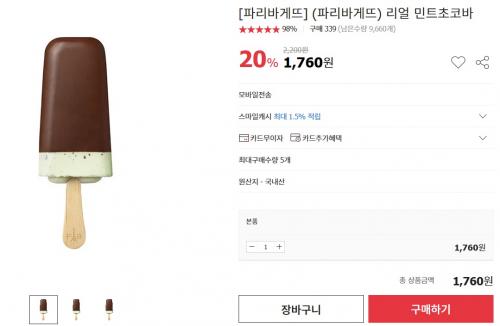 옥션에서 파리바게뜨 리얼 민트초코바를 1760원에 판매중입니다. 실제 가격은 2200원이며 상품평보니 타 제품으로