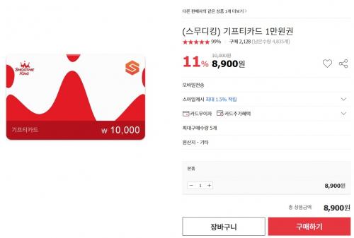 옥션에서 스무디킹 기프티카드 1만원권을 8900원에 팔고있습니다. 약 11프로 할인된 금액으로 팔고있으며 스무디