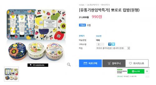 N쇼핑에서 뽀로로 립밤 2종을 990원에 유료배송으로 팔고있습니다. 전 립밤이라고 해서 립클루즈처럼 바르는건줄