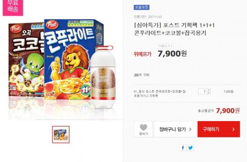 위메프에서 포스트 기획팩을 7900원에 무료배송으로 팔고있습니다. 구성은 코코볼 570G + 콘푸라이트 600G + 잡곡
