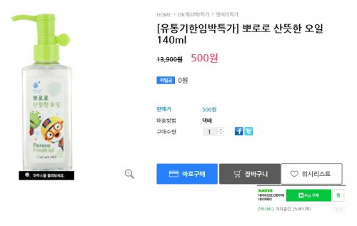 N쇼핑에서 뽀로로 산뜻한 오일 140ML을 500원에 팔고있습니다. 유통기한 임박특가로 9월21일까지라고 합니다.