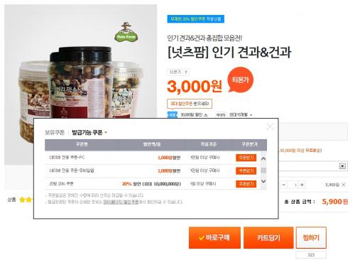 티몬에서 지퍼팩 믹스넛 900G을 5900원에 유료배송으로 팔고있습니다. 일단 배송비가 2500원 붙으나 3만원 이상