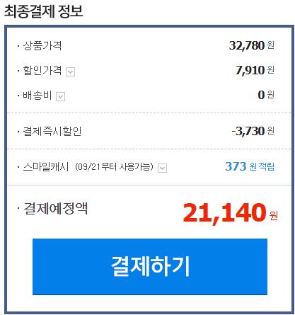 쿠폰 두개 적용하고 결제화면에서 카드할인 15%추가로 받으면 21,140원 나와요