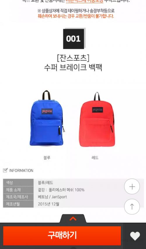잔스포츠 기본 모델입니다 색상은 블루 레드 2가지고요. 내구성 좋습니다. 수납은 앞의 포켓이 다입니다 (수납력 안좋음)