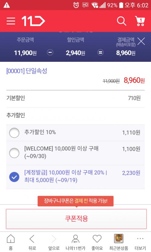 알고보니 그게 11번가에서 미고지한 부분이라 죄송하다면서 20프로 쿠폰을 준게 있어서 그걸 적용 시켰어요. 그랫더니 8960원 나오네요.