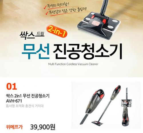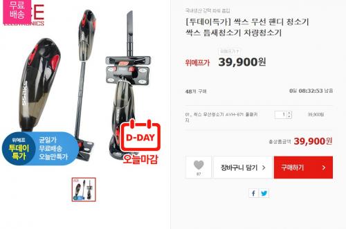 위메프에서 싹스 무선 핸디형 청소기를 39900원에 무료배송으로 팔고있습니다. 인터넷 최저가보니 풀구성이 4만원