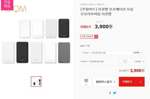 위메프에서 리큐엠 보조배터리를 3900원에 무료배송으로 팔고있습니다. 배터리 용량은 4000mAh 이며 C타입 케이