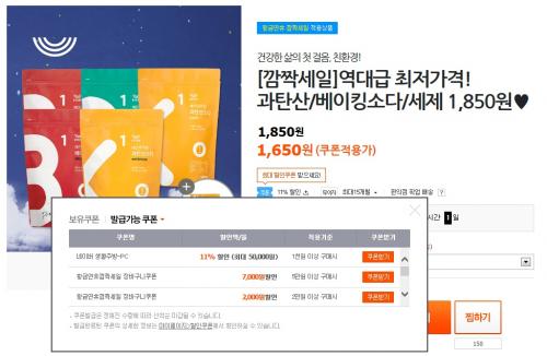 티몬에서 레인보우샵 과탄산/베이킹소다 세제를 1850원에 유료배송으로 팔고있습니다. 9800원이상 무료배송으로