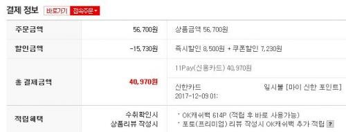 11pay 결제해야 사용가능한 카드사 쿠폰 15% 받아서 적용하면 40970원 나옵니다