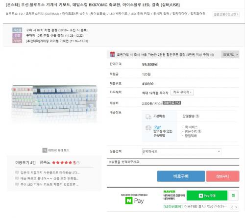 인터넷 최저가가 59800원이고 특별히 가격 세일하는건 없는데 단 컴퓨존만 구매시 사은품으로 블랙 87키 키캡을