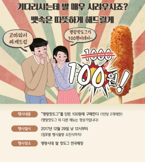 명랑핫도그 29일 낮12시부터 선착순 1인당2개제한 100원에 판매하네요~