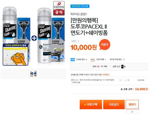 티몬에서 도루코 페이스XL 2 면도기 + 쉐이빙폼 1 + 1 + 카카오파우치를 10000원에 무료배송으로 팔고있습니다. 기