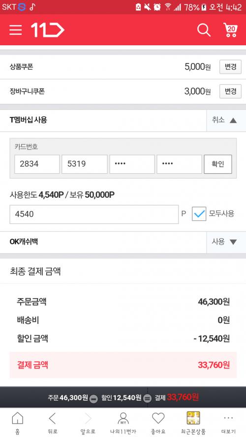 이때까지 11번가 지마켓 옥션 다 뒤져봤는데 최대 개당 약 75원 나오던데 오늘 70원까지 나오네요. 이 정도면 나름 싼것같습니다. 물론 티멤버쉽이 없으면 그리 싼편 아닙니다.