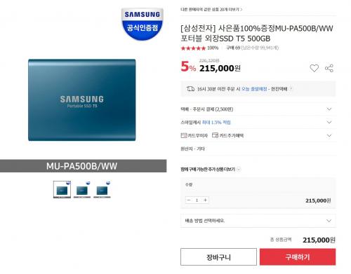 옥션에서 삼성전자 MU-PA500B/WW 포터블 외장 SSD 500GB + JBL GO을 215000원에 유료배송으로 팔고있습니