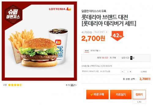 티몬에서 롯데리아 데리버거 세트를 2700원에 무료배송으로 팔고있습니다. 1인당 최대 4개까지 구매가능하며 필요