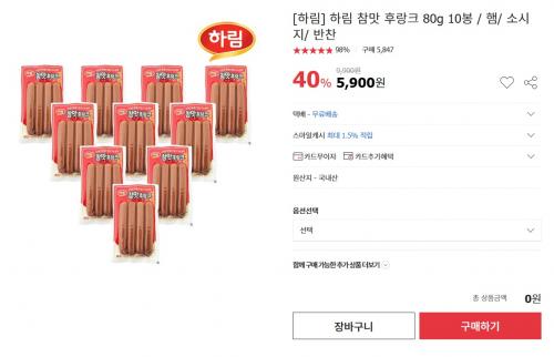 옥션에서 하림 참맛 후랑크 80GX10봉을 5900원에 무료배송으로 팔고있습니다. 예전에 같은가격에 같은구성으로