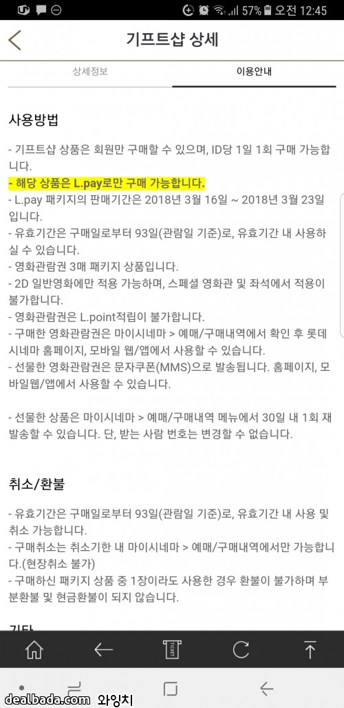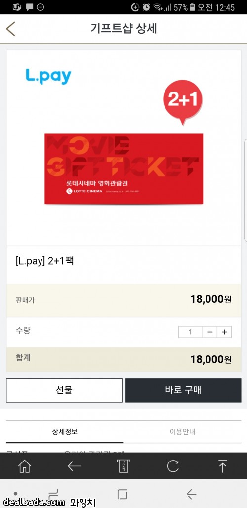 롯데시네마 예매권 3장 가격에 Lpay결제시 18,000원입니다.