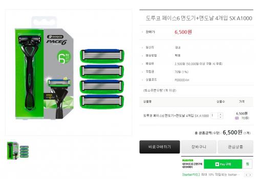 네이버쇼핑에서 도루코 페이스6 면도기 + 면도날 4개를 6500원에 유료배송으로 팔고있습니다. 추가로 네이버 포인
