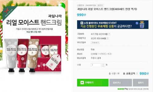 네이버쇼핑에서 과일나라 리얼 모이스트 핸드크림(400세트 한정 특가)을 990원에 유료배송으로 팔고있습니다. 400