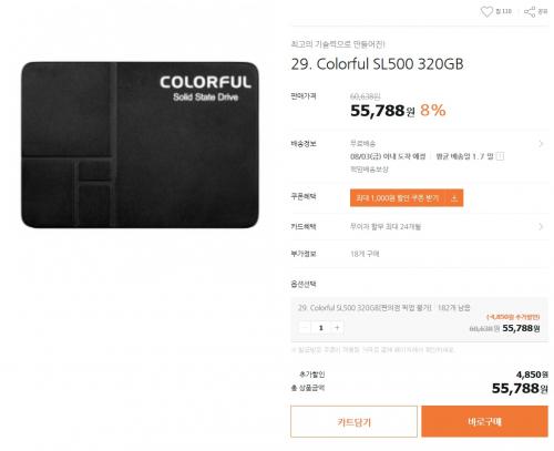 티몬에서 컬러풀 SL500 SSD 320GB를 55788원에 무료배송으로 팔고있습니다. 밑에 만리 1080TI 사은품으로 주길