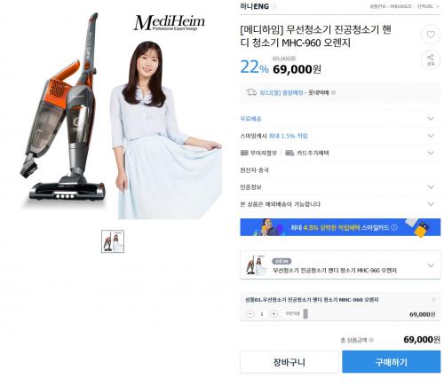 지마켓에서 메디하임 무선청소기 MHD-690을 69000원에 무료배송으로 팔고있습니다. 현재 인터넷 최저가 91480원
