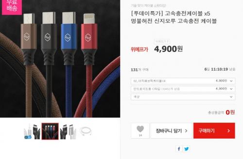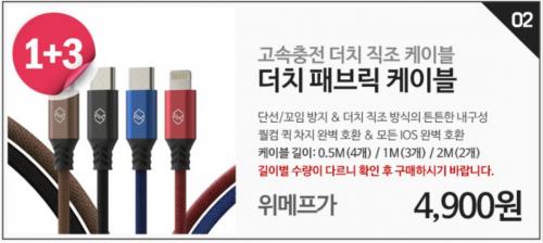 위메프에서 신지모루 더치 패브릭 케이블 5핀 or C타입 4개를 4900원에 무료배송으로 팔고있습니다. 길이는 50CM