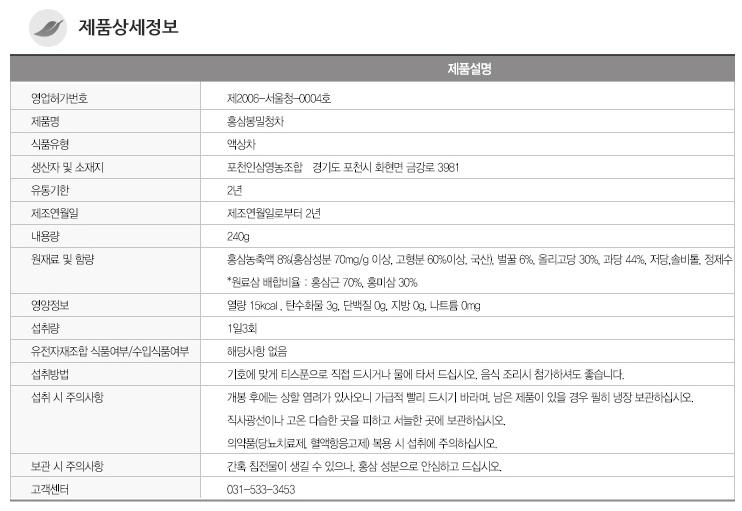 은 "홍삼농축액(홍삼성분70mg/g 이상 고형분 60%이상) 8%에 벌꿀 6%, 올리고당 30% 과당 44% 및 저당 및 솔