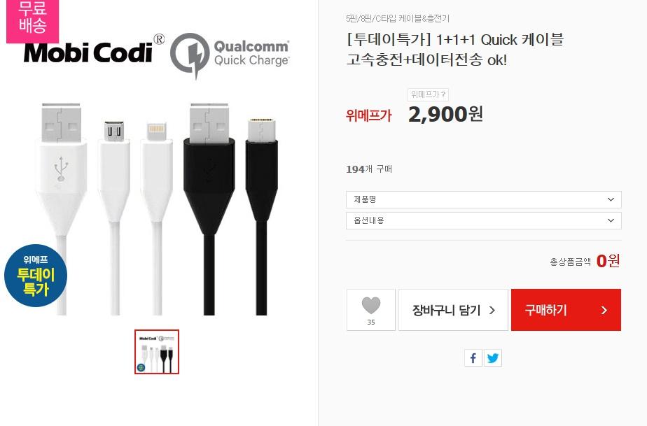 위메프에서 모비코드 고속충전 케이블 X 3개를 2900원에 무료배송으로 팔고있습니다.