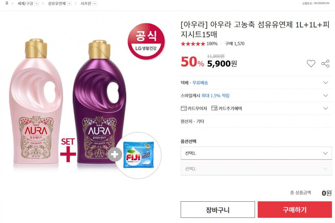아우라 1L 기준 네이버 지식쇼핑 최저가 2660원 + 배송비 2500원이니 2개에 + 사은품으로 FiJi 세탁세제 시트15매 +