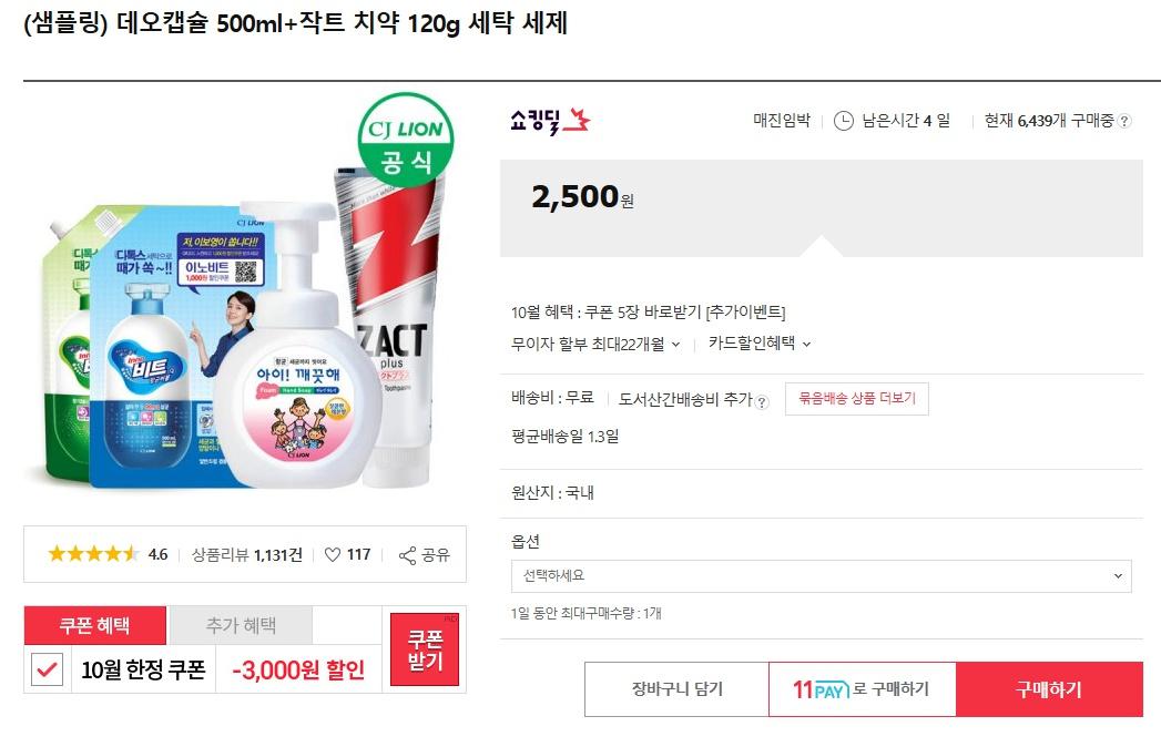 11번가에서 비트 데오캡슐 500ML + 작트치약 120G 샘플링을 2500원에 무료배송으로 팔고있습니다. 비트 데오캡슐