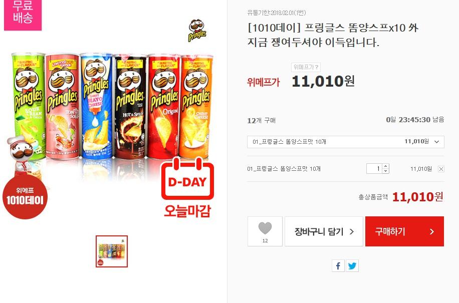 위메프에서 프링글스 똠양꿍맛 X 10개를 11010원에 무료배송으로 팔고있습니다. 똠양꿍맛이라고 해서 검색해보니