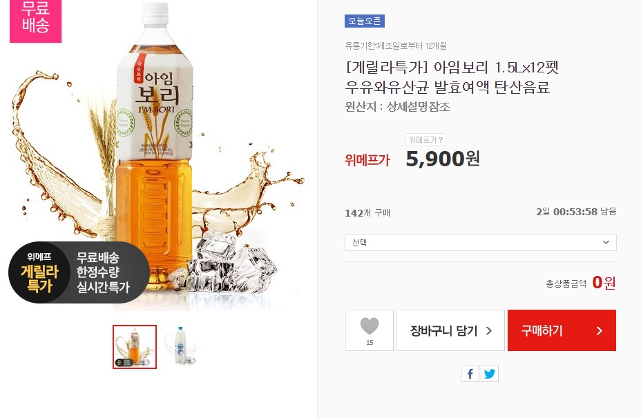 위메프에서 심야특가로 아임보리 OR 몰랑팝 1.5L X 12펫을 5900원에 무료배송으로 팔고있습니다. 엄청싼가격인대