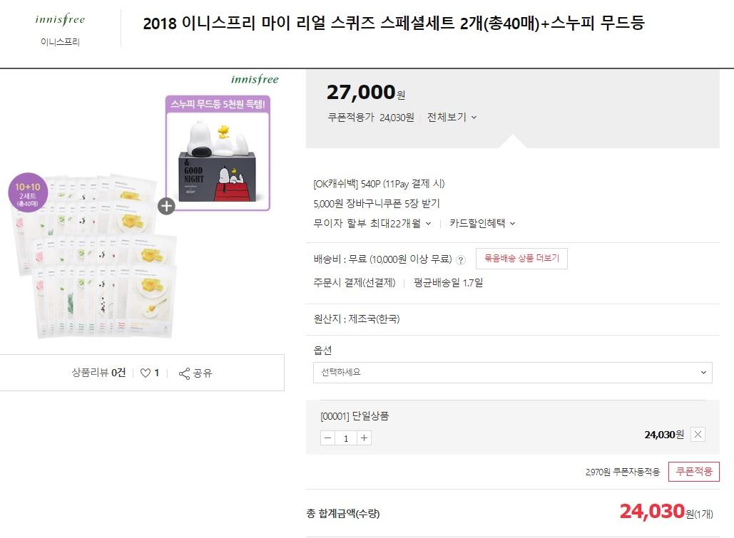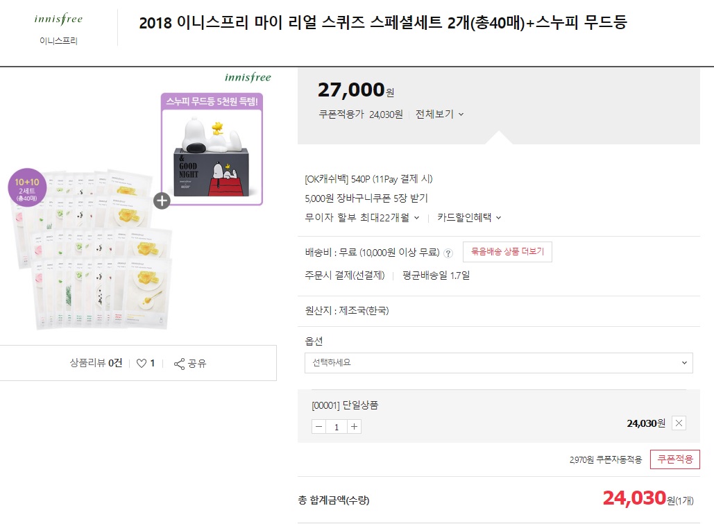 어제 지나다보니 이니스프리매장에서 마스크팩 10+10 행사를 또 하더군요~