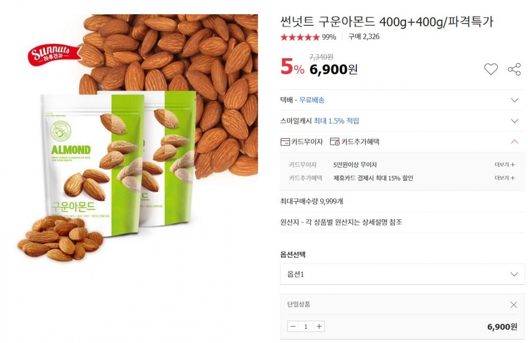 [옥션] 썬넛트 구운아몬드 400g+400g (6,900원/무료배송) > 이건어때