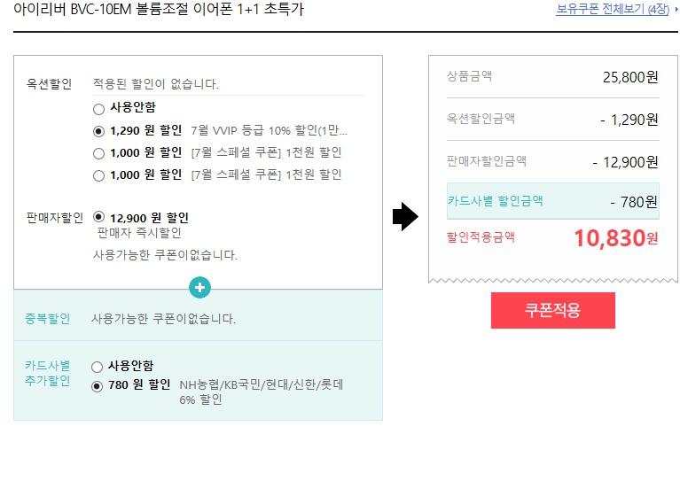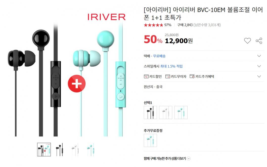 봤더니 아이리버 이어폰도 1+1로 행사중이네요 가격은 12900원인데 추가로 1만원이상 10프로 할인쿠폰적용과 카드