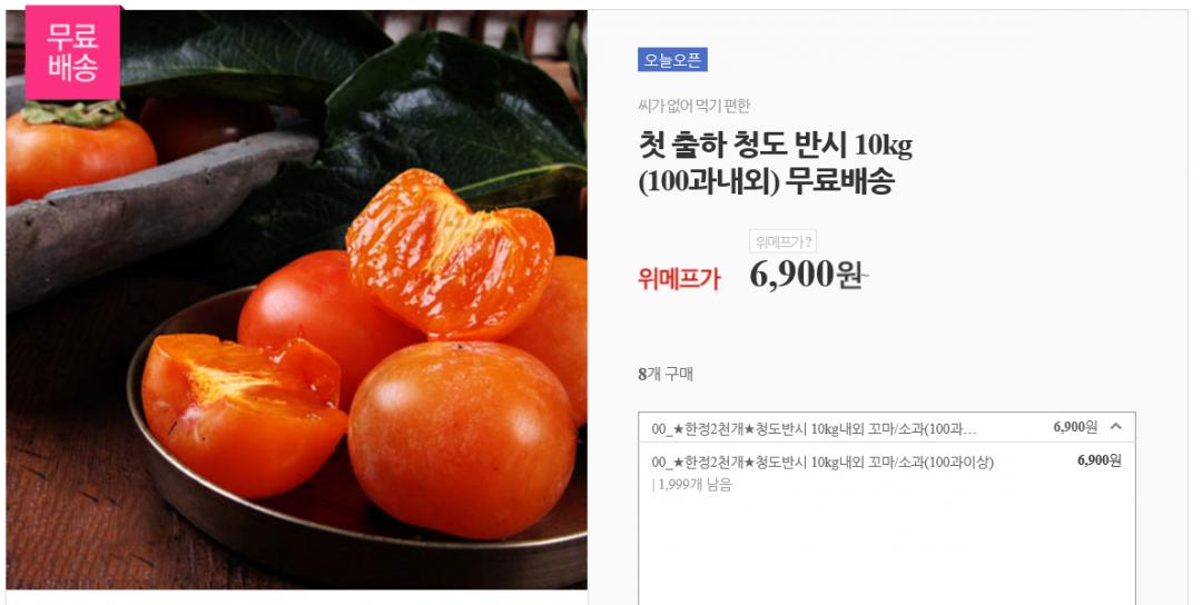 청도반시 10kg 작년같은경우 10월하순쯤인가 옥션에서 5900원인가 5500원까지 떨어졌습니다. 거기다가 옥션 누구에게나 5000원이상 1000원 할인쿠폰 적용시키면 5000원이 채 안되죠. 택배비 제외하면 1개에 50원도 채 안되는데 과연 인건비나 나올런지는 모르겠어요. |