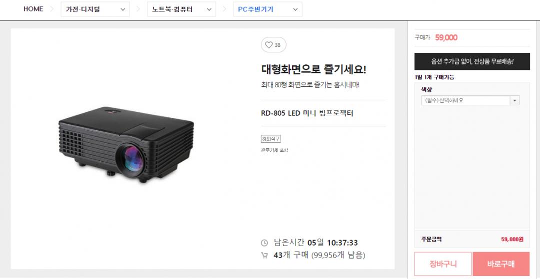 UC40, GM60과 더불어 저렴이 가성비 빔프로젝터로 유명한 RD-805 입니다.