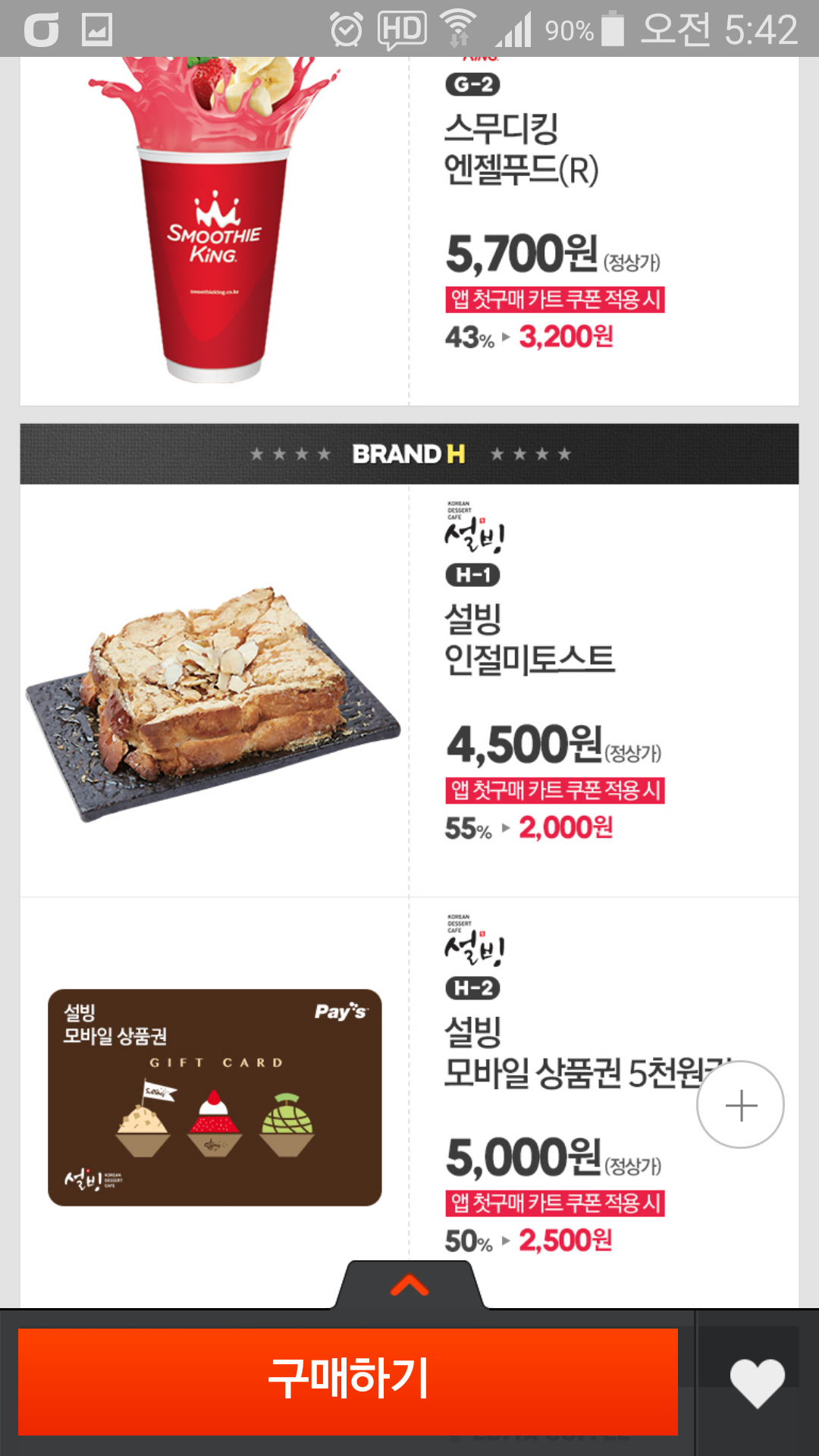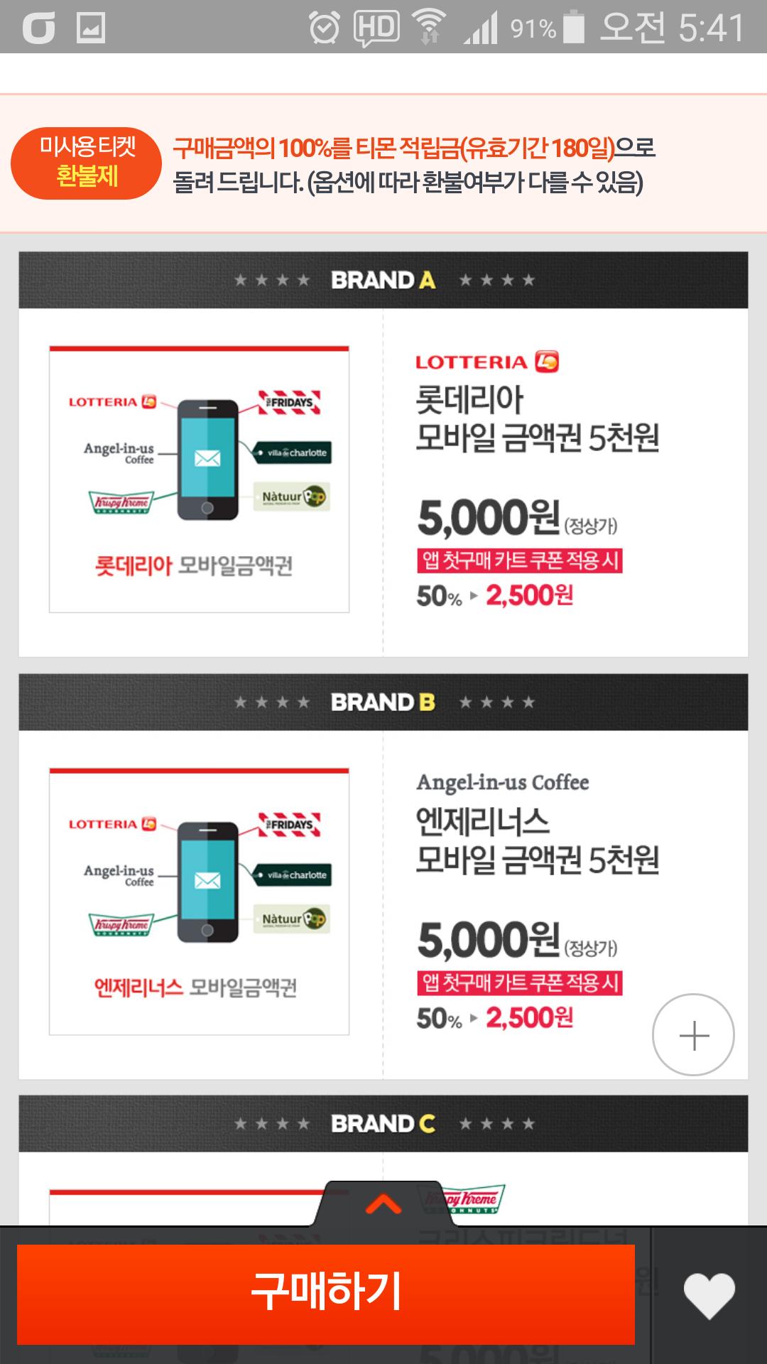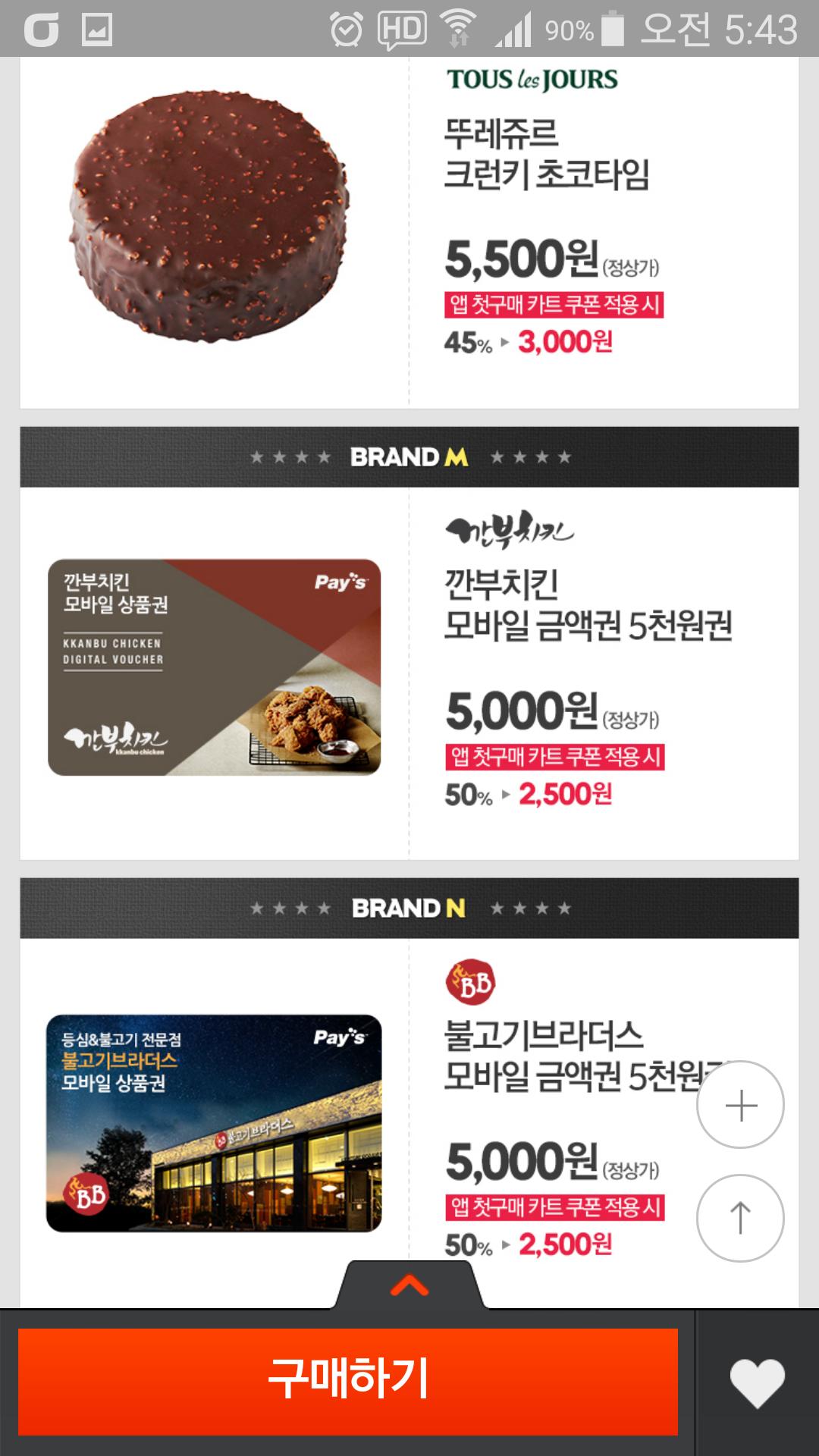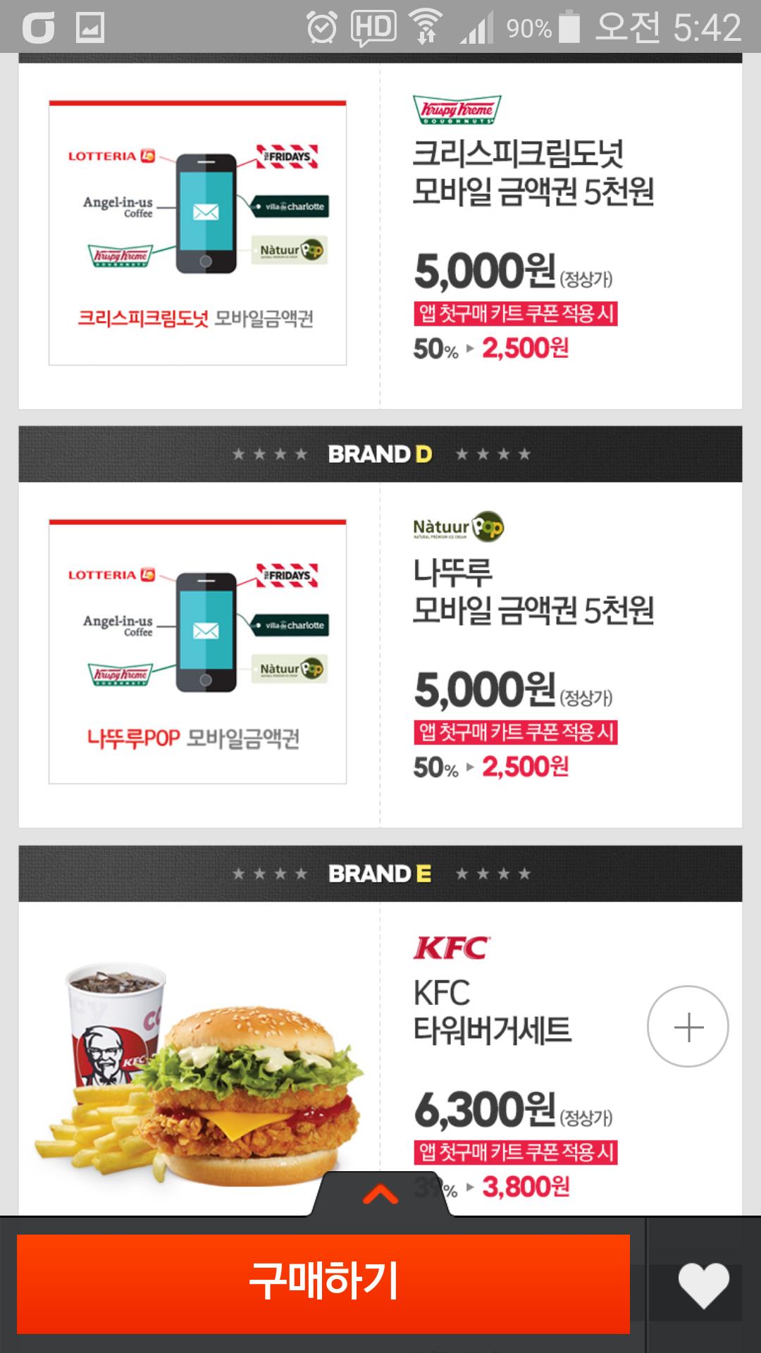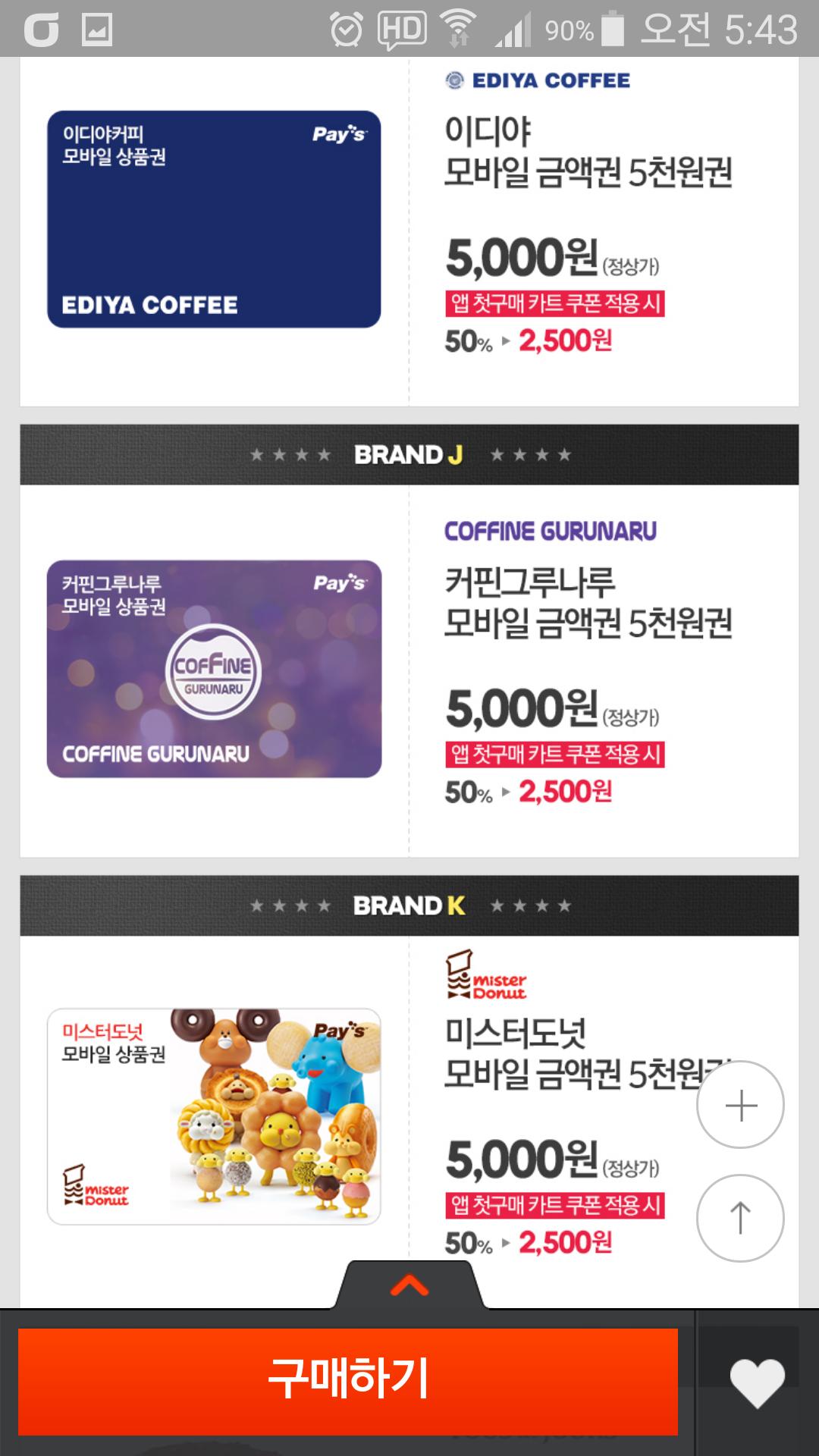 롯데리아 5천원권 외 여러가지 모바일 상품권입니다. 매달 주는 앱 첫구매 쿠폰(3천원이상 2,500원 할인) 적용하면 저렴하게 구입할 수 있습니다. 아직 쿠폰 사용 안하신 분들에게 추천합니다.