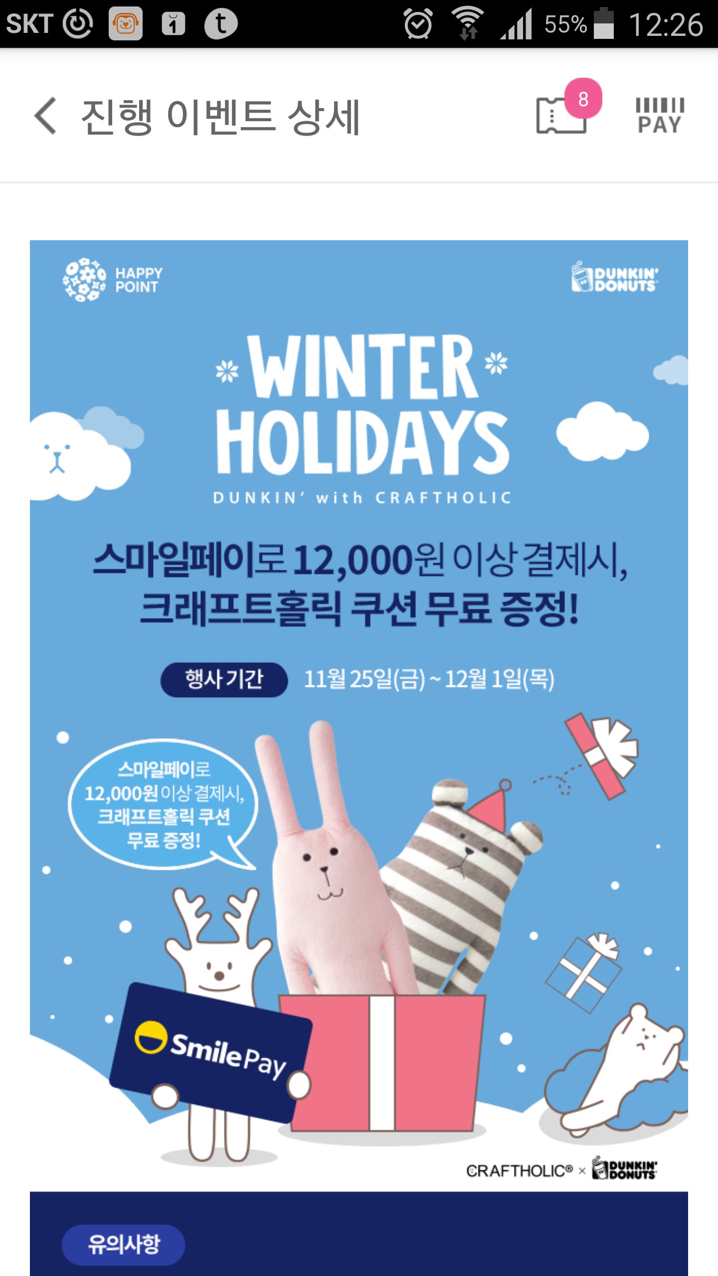 [해피포인트앱] 던킨크래프트홀릭 쿠션 (스마일패이결제12,000원/무료)
